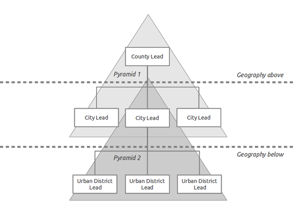 Тож головний месидж тут такий: жоден лідер географічної одиниці не повинен мати більш ніж шість осіб, які безпосередньо працюють із ним чи нею по певному контексту. Це означає, що ми в опорній структурі рою створюємо певну кількість організаційних міні-пірамід, рухаючись згори, де в кожній (максимум) сім осіб, і де кожен лідер географічної одиниці є внизу однієї піраміди і на вершині іншої, тієї, що знаходиться безпосередньо знизу – як це показано на ілюстрації: